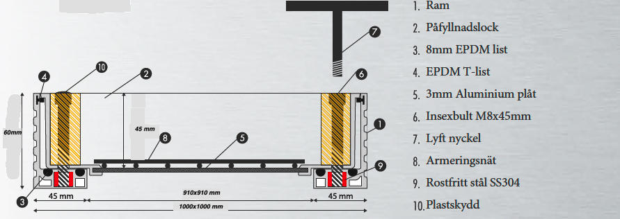 Golvlucka 1000×1000 mm. i aluminum för ingjutning, luckorna är både gas och vattentät. Tätningslisterna tål kemikalier och hindrar även smuts att tränga ner. Luckorna låses med 4 st. insex bultar. Tack vare de små hörnen och den mått noggranna kantkonstruktionen är luckan nästan osynlig monterad i golvet. Luckan är armerad inuti, vilket ökar dess belastningshållbarhet.
