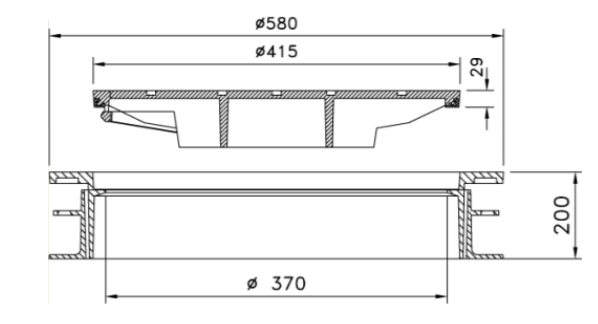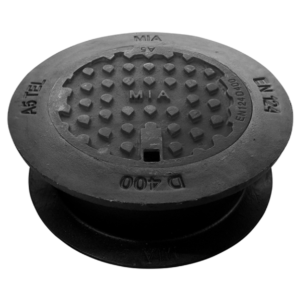 Täydellinen teleskooppinen A5-kansi pallografiittivaluraudasta, tarkoitettu ø400 mm:n betonikaivoille. Kansi polyuretaanista valmistetulla kulumis-/vaimennusmateriaalilla, lukitusvarsilla ja tiivistetyllä sylkyreiällä.
