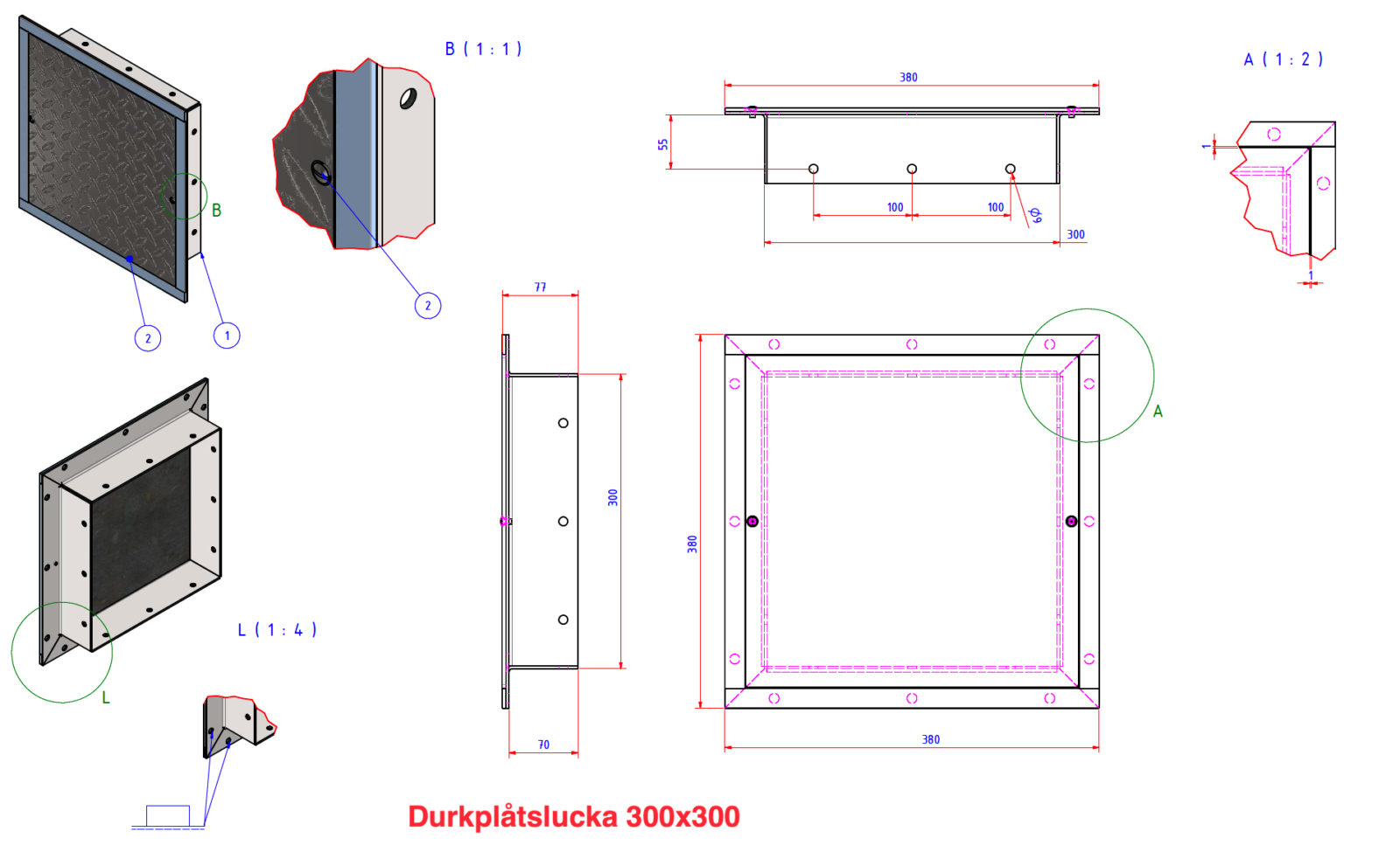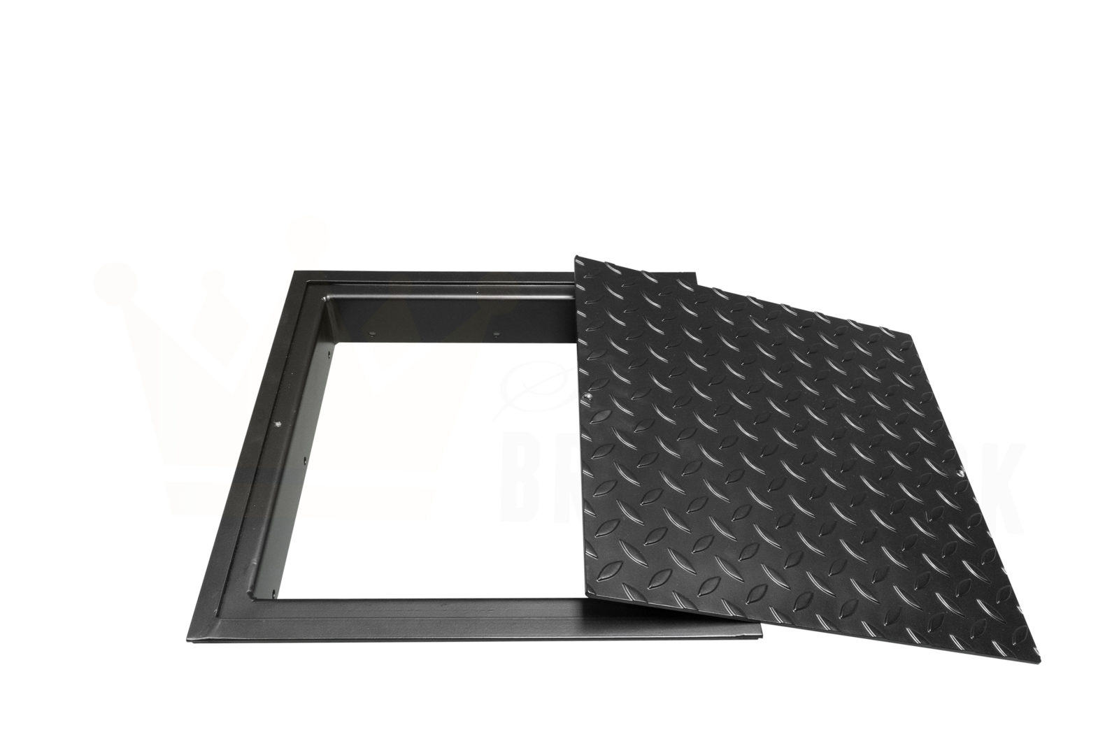Lattialevyluukku 300 × 300 mm lattiaan ja seinään. Mustaksi pulverimaalattu, sopii sekä sisä- että ulkokäyttöön. Kansi lukitaan upotetuilla ruuveilla.