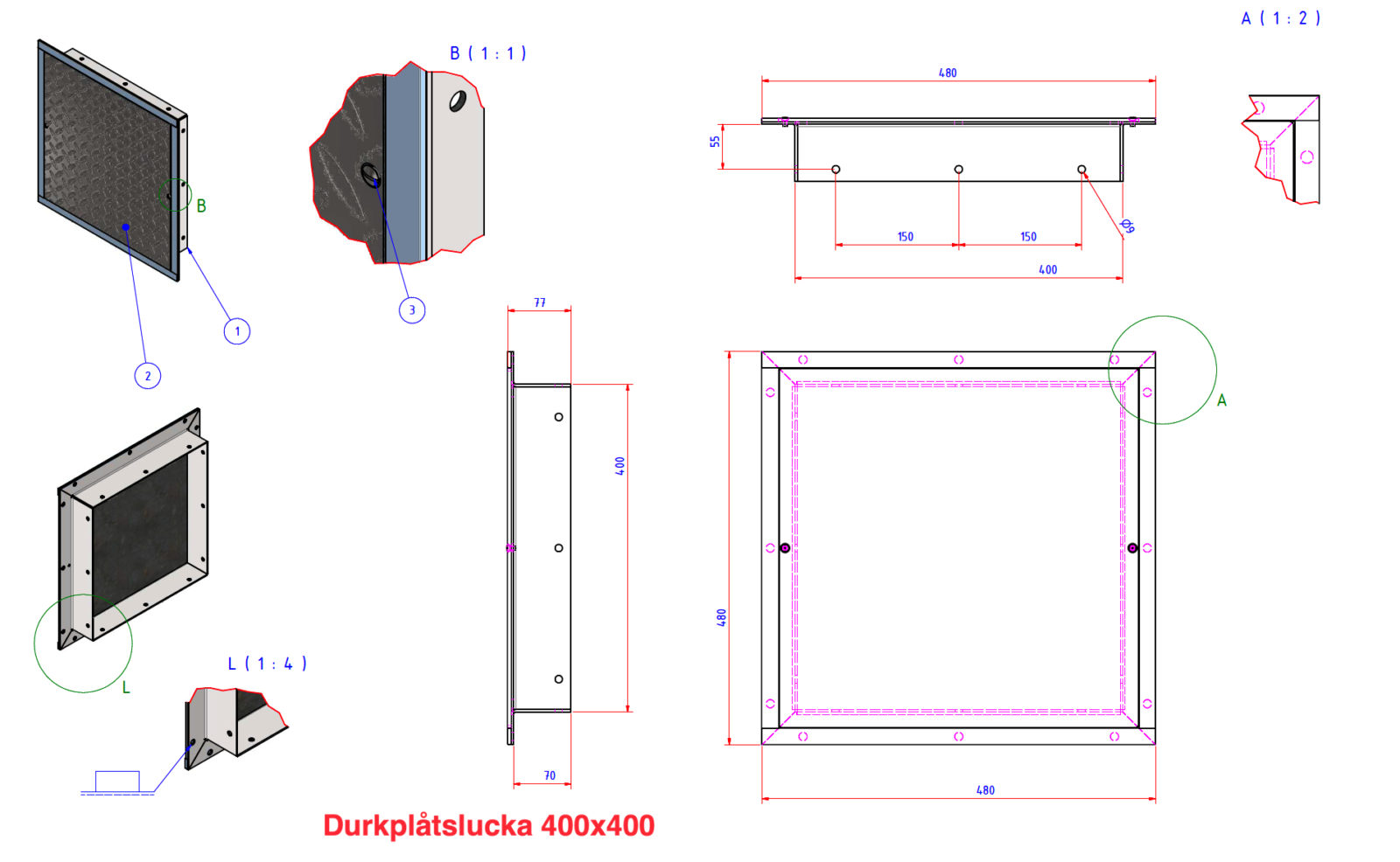 Lattialle ja seinälle sopiva 400 × 400 mm levyluukku. Mustaksi pulverimaalattu, sopii sekä sisä- että ulkokäyttöön. Kansi lukitaan upotetuilla ruuveilla.