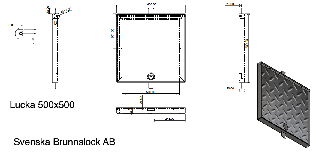 Tasainen ovi 500x500mm Saranoilla, joita voidaan käyttää sekä ulkona että sisällä esimerkiksi tarkastus- tai huoltoluukkuna. Toimitetaan karmilla, joka voidaan valaa lattiarakenteeseen tai rakentaa sen sisään. Voidaan käyttää lattia- tai seinäluukkuna.